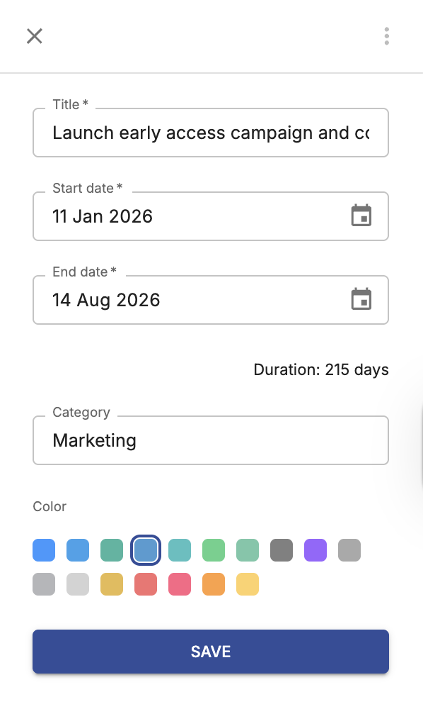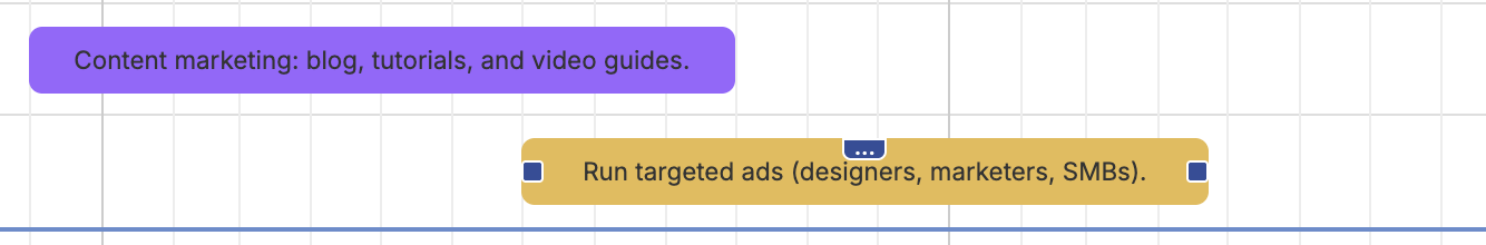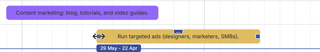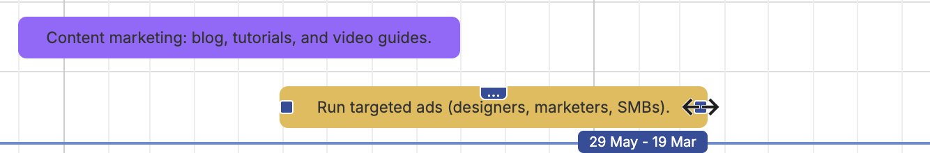 Like you saw in the edit activity section, you can change the start date, end date, and duration of an activity by clicking on the respective fields in the right side panel. However, there is also a more visual way to do this directly on the roadmap.