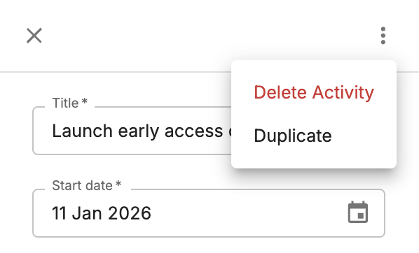 To duplicate an activity, select the activity you want to copy. Then, on the right side panel, click on the menu icon (three vertical dots).